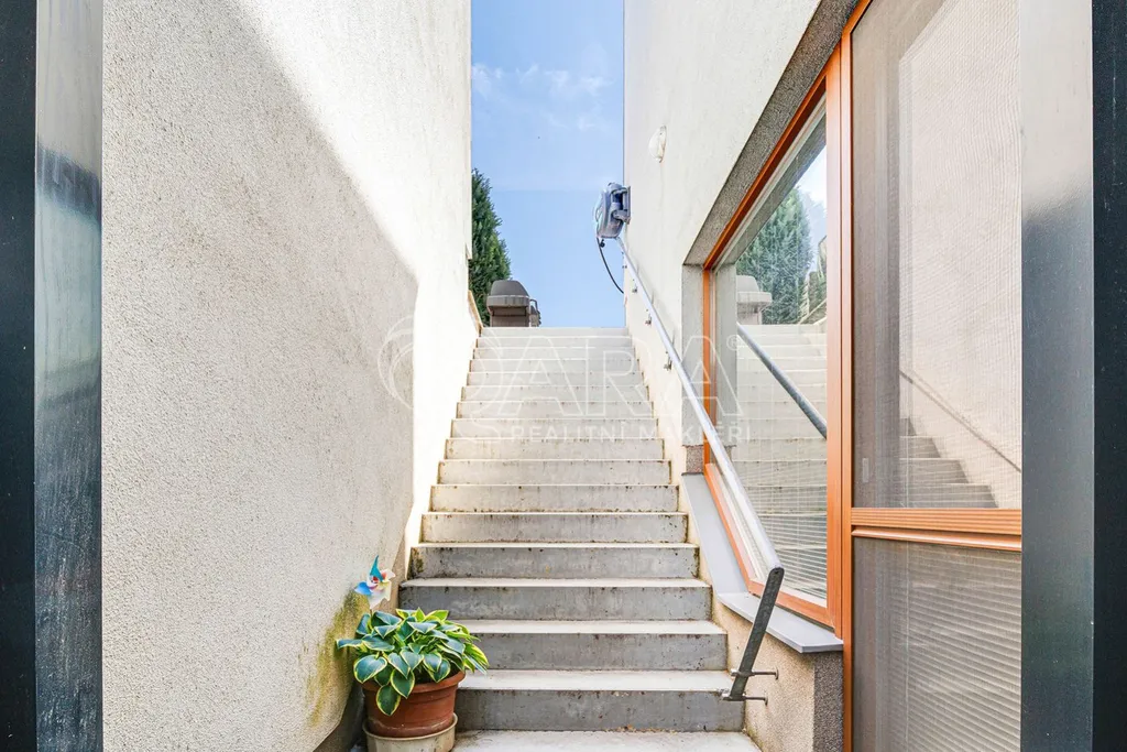 V horním patře domu se nachází velká manželská ložnice s další terasou. Ve středním patře mohou být dva dětské pokoje - aktuálně jsou ale spojené v jeden velký pokoj. Na patře se dále nachází koupelna s vanou. Pokoj pro hosty s druhou koupelnu se sprchovým koutem a komoru pak najdete v nejnižším podlaží domu. Z pokoje pro hosty je možné se přes venkovní schodiště projít na zahrádku. V domě jsou instalovány tři velké vestavěné skříně.