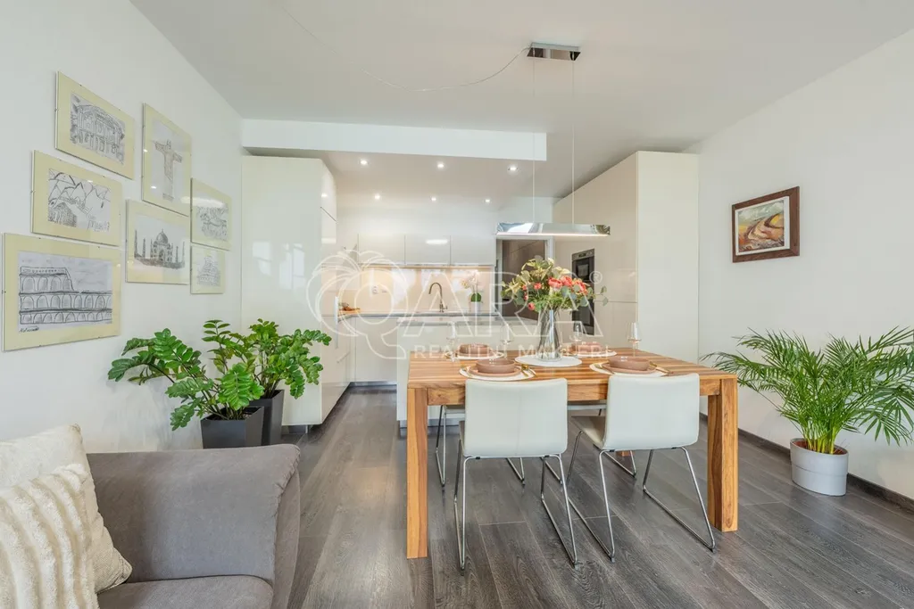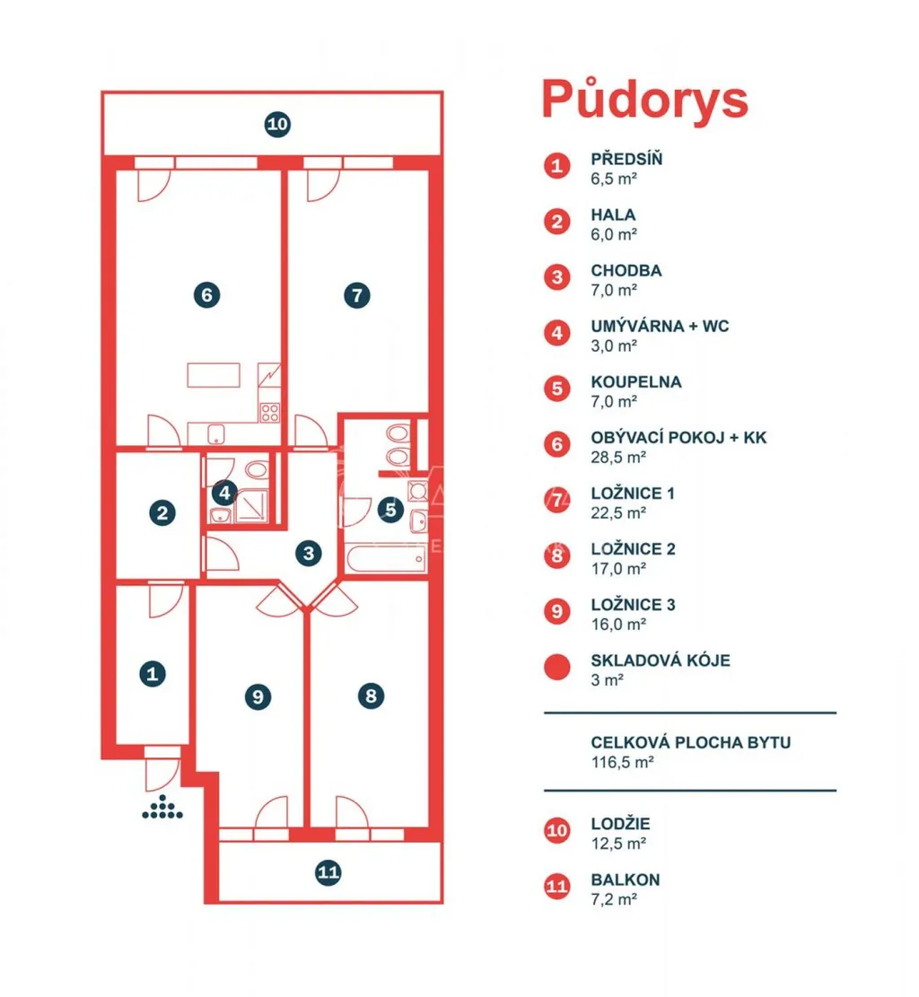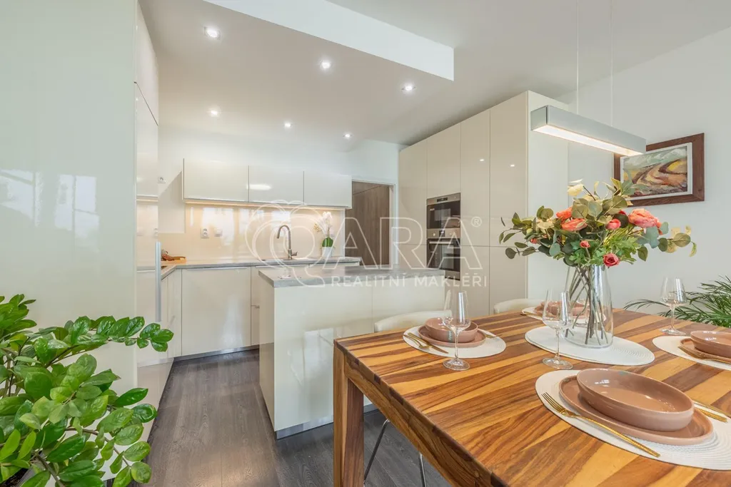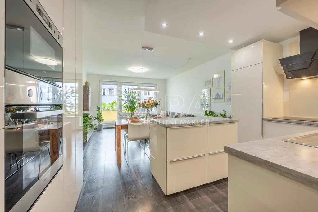 Byt o celkové výměře 136,2 m2 (vnitřní plocha 113,5 m2, balkon 7,2 m2, lodžie 12,5 m2) je výjimečně dobře dispozičně řešen a sestává ze vstupní chodby, obývacího pokoje s kuchyňským koutem, 3 ložnic, koupelny se sprchovým koutem a WC, chodby a koupelny s vanou a s WC. Z obývacího pokoje a ložnice je možný vstup na jižně orientovanou lodžii, ze dvou dalších ložnic pak je vstup na severně orientovaný balkon. V celém bytě je položena plovoucí podlaha, v předsíni a v koupelnách je dlažba. Vytápění zajišťuje centrální plynová kotelna v domě. Měsíční poplatky za byt jsou 3 995,- Kč + zálohy na elektřinu. Dům je vybaven výtahem. V suterénu domu jsou garáže vybavené kamerovým systémem, kde je možnost pronajmout si garážové stání.