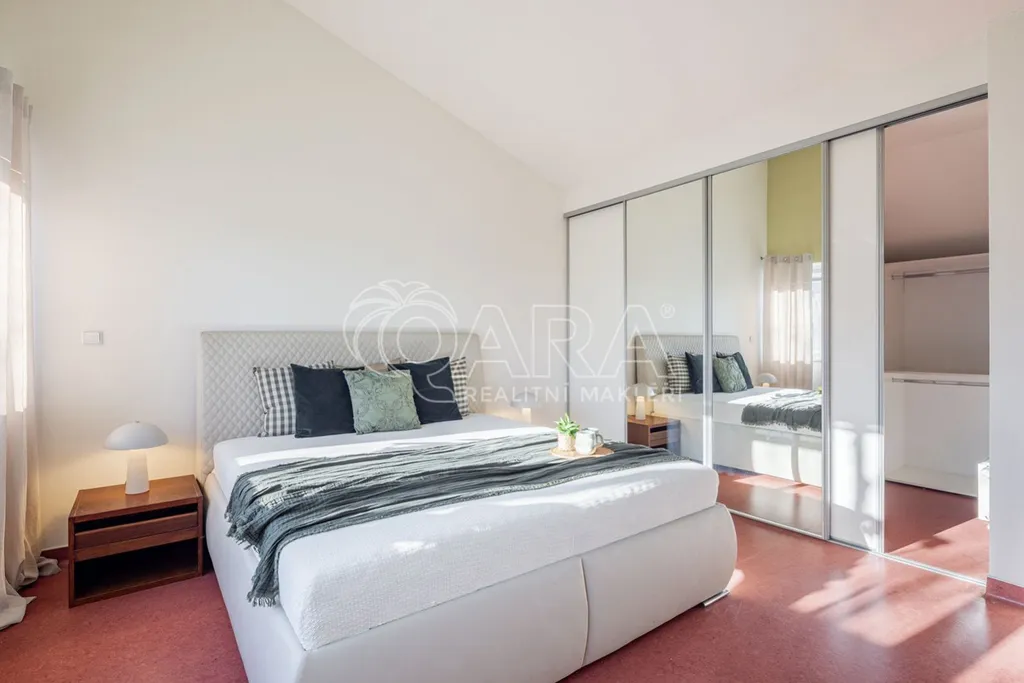 V horní patře pak najdete 3 plnohodnotné ložnice. Dvě menší z nich jsou zamýšlené jako dětské pokoje, kde lze pro maximalizaci využití prostoru instalovat i spací patro pod zvýšeným stropem.