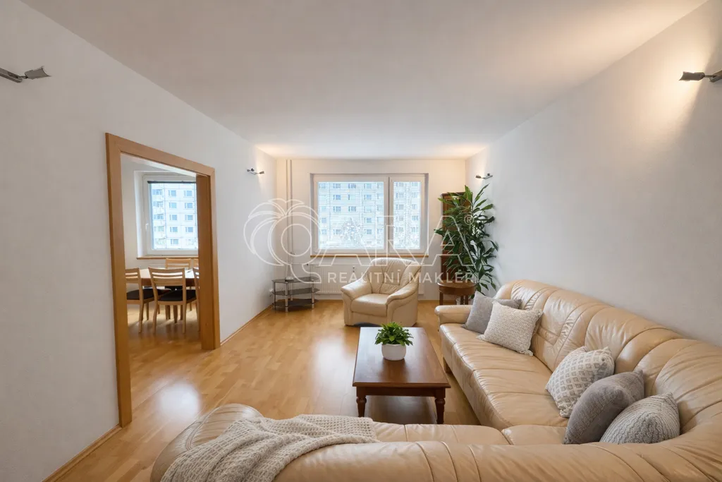 Jednotka se nabízí kompletně vybavena kvalitním, dřevěným nábytkem, viz fotografie. K dispozici jsou čtyři samostatné, neprůchozí pokoje, vhodné jako ložnice, pracovna nebo dětské pokoje ve kterých jsou vestavěné skříně. Z hlavní ložnice je vstup také na prostorný balkon. Obývací pokoj je vybaven koženou sedací soupravou a plynule navazuje na kuchyň. Ta je plně vybavena kvalitními spotřebiči značky AEG (lednice s mrazákem, myčka, trouba, varná deska, digestoř, kávovar) a nabízí dostatek úložného prostoru i nádobí.