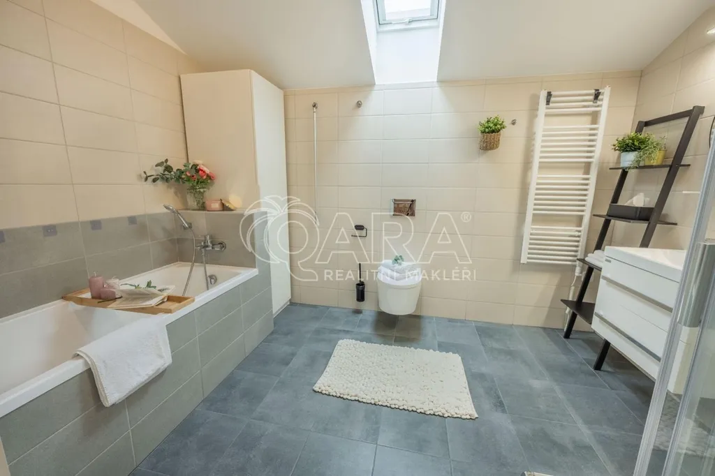 V celém domě je položena plovoucí podlaha, v koupelnách a technické místnosti je dlažba. Z obývacího pokoje je možný vstup na terasu a zahradu francouzskými okny. Vybudováno je parkovací stání pro čtyři automobily za elektrickou pojezdovou branou. Přístup do domu je z přilehlé komunikace. Zahrada je upravená a zatravněná, pozemek má pravidelný rovinatý tvar.