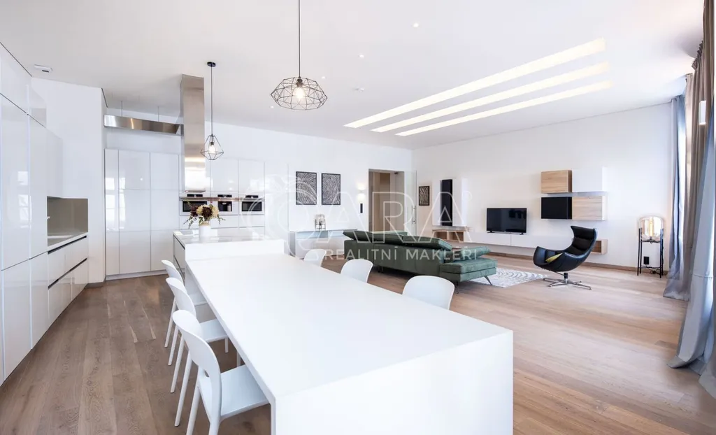 Pronájem designového, špičkově vybaveného luxusního bytu, 3kk, 186m2 v 1. patře nákladně rekonstruované residence. Lokalita v srdci metropole je perfektně dostupná MHD, autem i na kole a nabízí překvapivě klidné a příjemné městské bydlení se všemi službami v bezprostřední blízkosti.
