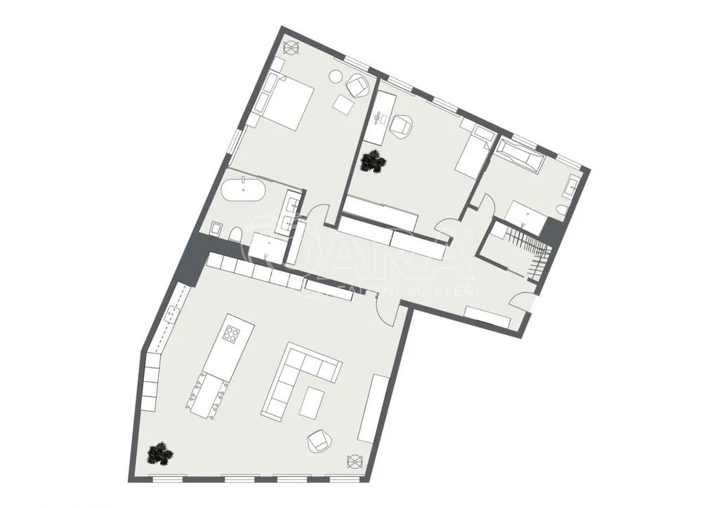 Bytu dominuje otevřený prostor obývacího pokoje s kuchyní, dvě prostorné ložnice, jedna ložnice s vlastní koupelnou s vanou a sprchovým koutem, druhá koupelna opět s vanou a sprchovým koutem.