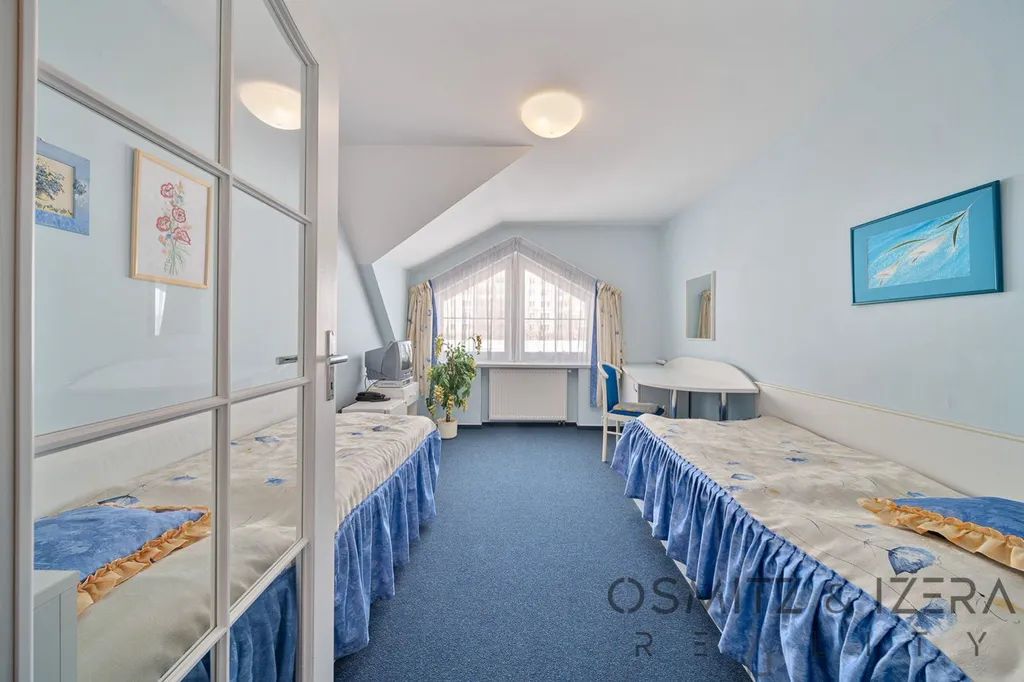 Nadzemní podlaží: 12 pokojů + 1 apartmán, každý s vlastním sociálním zařízením, 5 pokojů s balkónem.