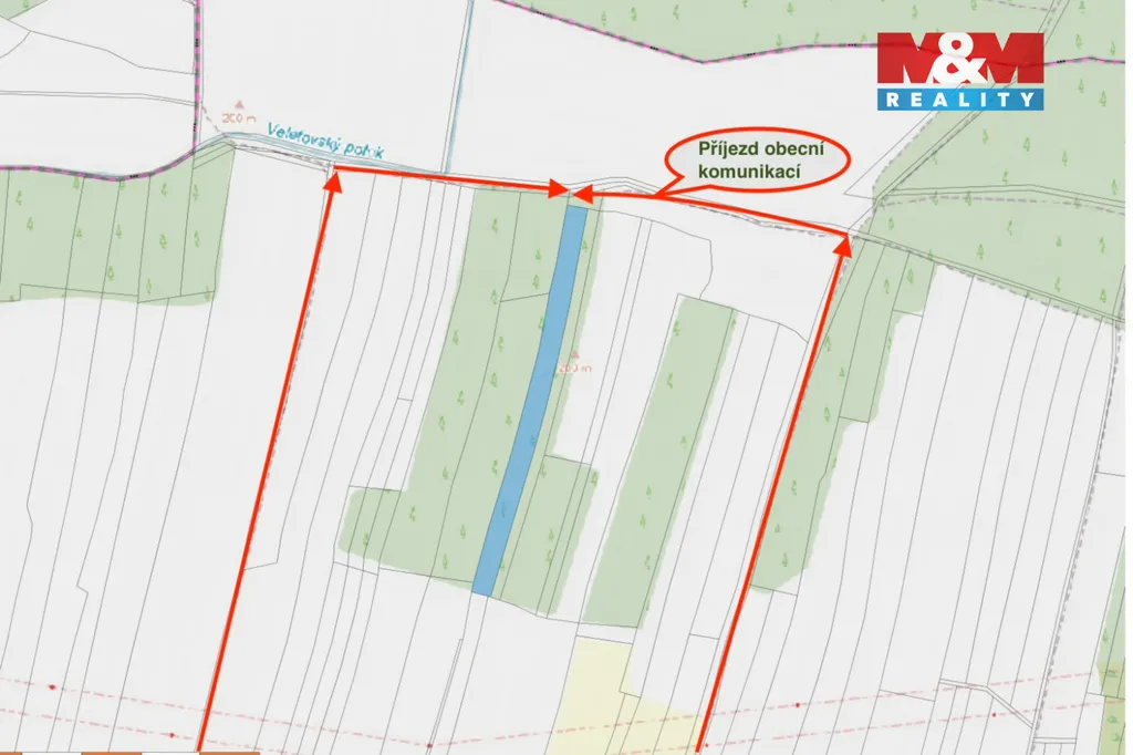 Prodej lesního pozemku v katastrálním území Veletov (okres Kolín) o výměře 5 891 m². Pozemek není zalesněn, porostlý několika samovolně vyrostlými stromy. Velkou výhodou je příjezd po obecní komunikaci, umožňující snadný přístup pro hospodářské práce. Pozemek je v dobrém stavu. K parcele není zapsána hodnota bonity půdy. Půda typická pro Veletov je bohatá na písek. Na okolních pozemcích jsou převážně pěstovány borovice. Pozemek je vhodný pro výsadbu lesa, nebo jako investice. Pro více informací prosím kontaktujte makléře.
