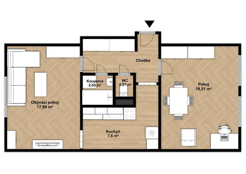 Nabízí poctivou a dobře využitelnou dispozici, která dnes u podobně velkých bytů nebývá samozřejmostí. Velkým benefitem je ložnice o velikosti téměř 20 m and sup2; se dvěma okny, kterou lze rozdělit na dva samostatné pokoje. Byt tak může po úpravě fungovat i jako 3+1. Dispozici tvoří vstupní chodba, samostatná kuchyně, obývací pokoj, velká ložnice, koupelna s vanou a oddělené WC.