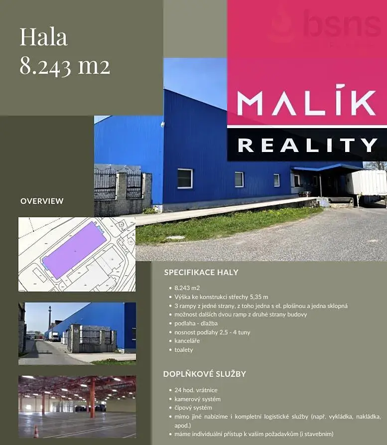 Celková plocha haly je 8.243m2, výška ke konstrukci střechy 5,35m. Na podlaze je dlažba, nosnost podlahy se pohybuje od 2,5 do 4t/m2.