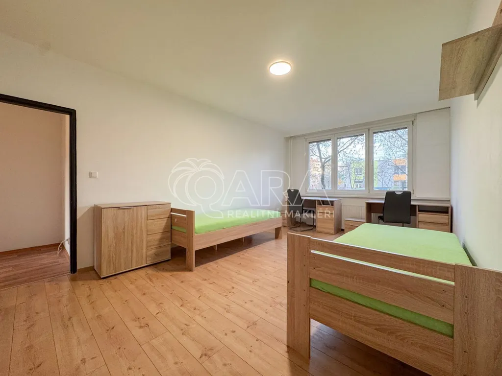 Bytová jednotka je po rekonstrukci, udržovaná, plně vybavená a připravená k okamžitému nastěhování. Dispozice je velmi praktická: vstupní chodba s šatnou poskytuje dostatek úložného prostoru, dále je zde samostatné WC, koupelna s vanou, kuchyně s jídelním stolem a 3 plně vybavené studentské obytné pokoje. Neprůchozí pokoje nabízejí ideální podmínky s dostatkem soukromí a celkově komfortní prostor až pro 5 osob.