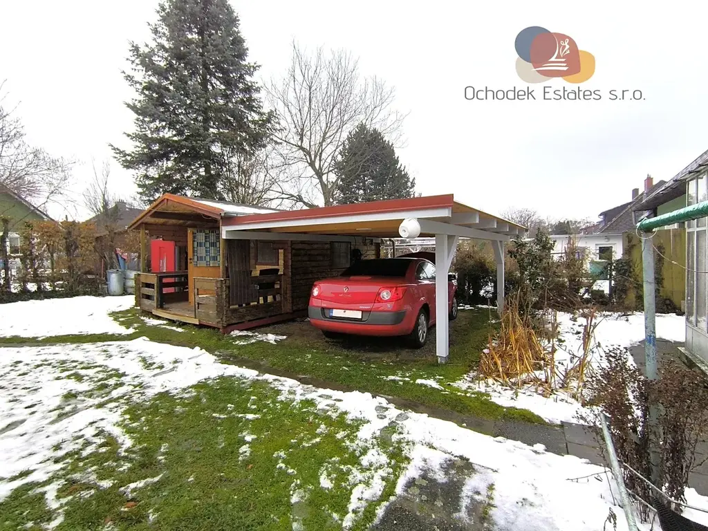 - zahrada s novým přístřeškem na auto, zahradní chata na nářadí, 3 dlážděná parkovací stání