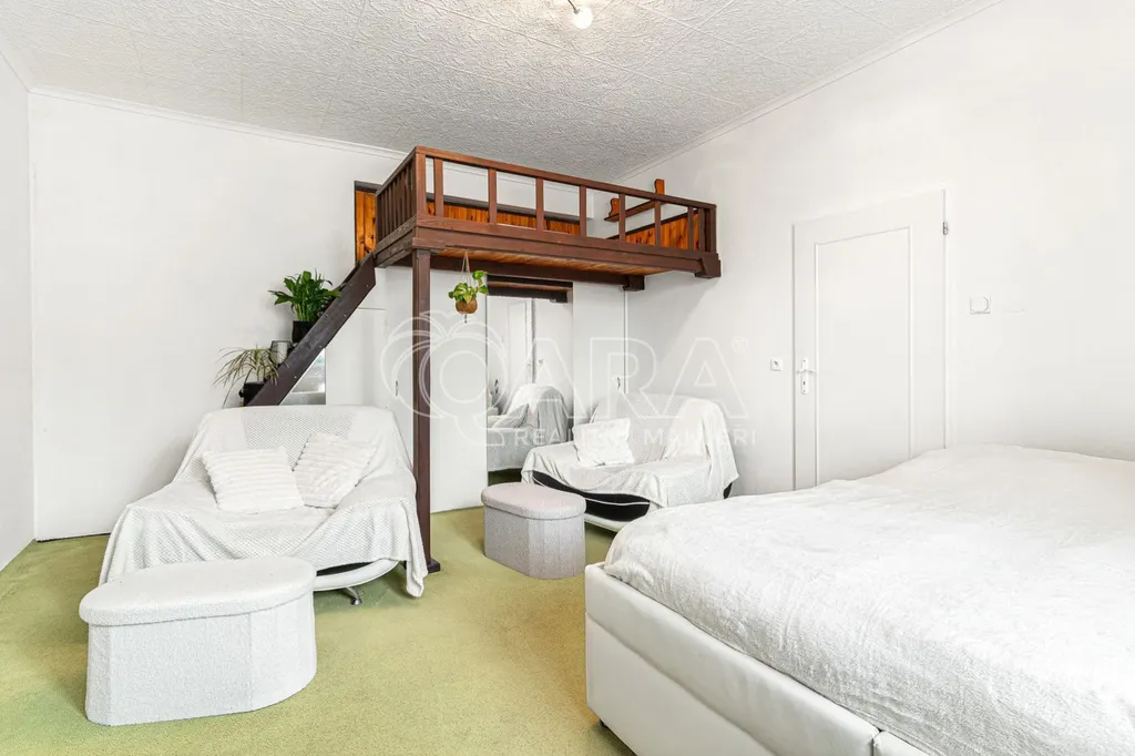 Dominantou bytu je vybudované spací patro, které chytře využívá výšku stropu a výrazně zvětšuje obytný prostor. Nechybí ani vestavěná skříň, která poskytuje dostatek úložných prostor.