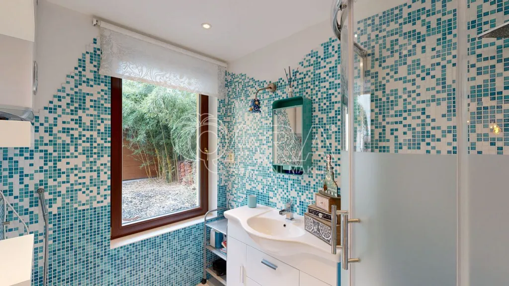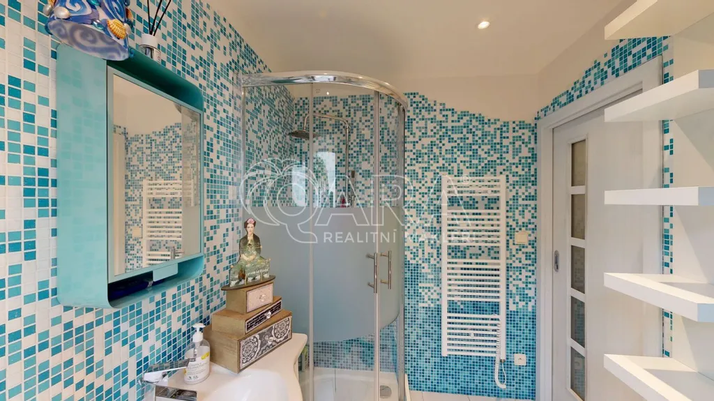 Ručně vyráběné mozaiky v kuchyni i na parapetech, práce se dřevem, krbová kamna, promyšlené detaily, které nepůsobí okázale, ale přirozeně. Velkorysá knihovna, chytré úložné prostory, světlo proudící do dvorního ticha všechno dohromady vytváří harmonii, která se dnes hledá jen těžko.