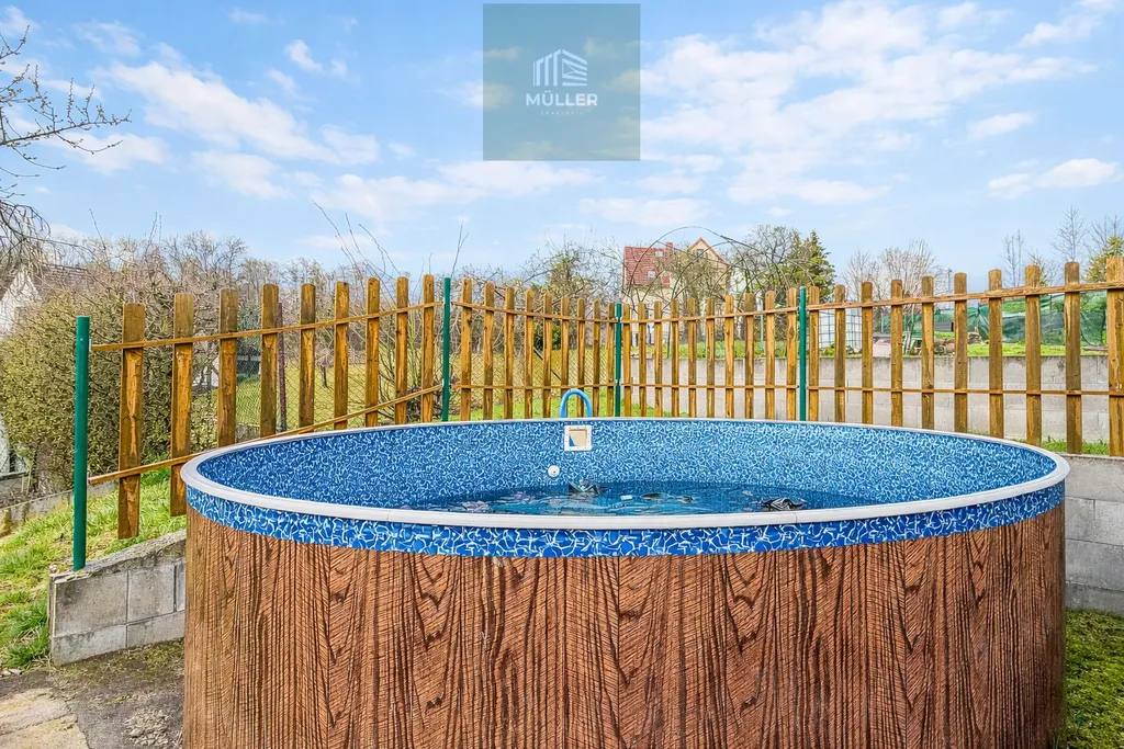 Dům je situován na pozemku o celkové výměře 1 086 m². Součástí je slunná a udržovaná zahrada s bazénem, která nabízí dostatek prostoru pro odpočinek, rodinné aktivity i zahradničení. K dispozici je dále terasa (veranda), sklep a především prostorné půdní prostory, které vybízí k vybudování dalších obytných místností a rozšíření současného komfortu bydlení.