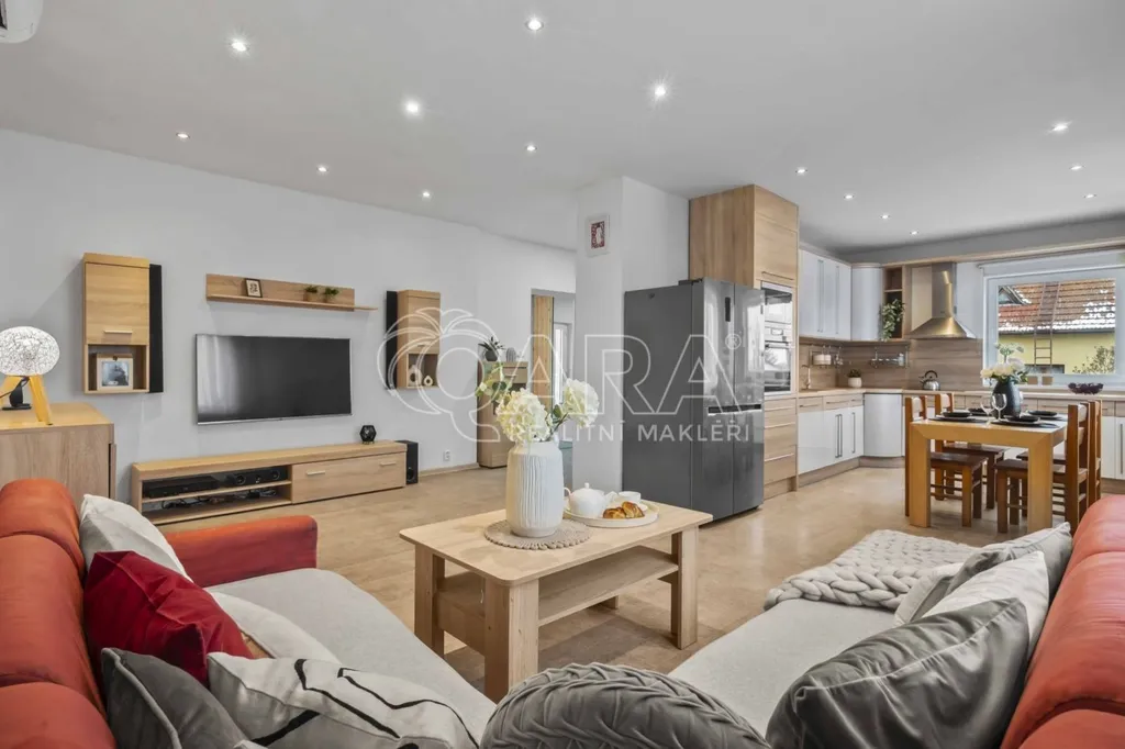 První nadzemní podlaží tvoří předsíň se šatnou (10 m2), prostorný obývací pokoj s kuchyňským koutem (cca 41 m2), koupelna s vanou (3 m2) a samostatná toaleta (1,3 m2). Moderní kuchyňská linka je vybavena vestavnými spotřebiči.