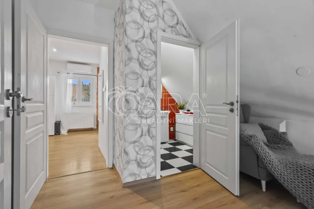 Druhé nadzemní podlaží sestává z chodby, dětského pokoje (cca 21 m2), ložnice (cca 12 m2) a koupelny se sprchovým koutem a toaletou (3,2 m2). V půdním prostoru (cca 18 m2) je pak možnost uložení dalších věcí. V suterénu domu se nachází technická místnost s dílnou (cca 17,6 m2).