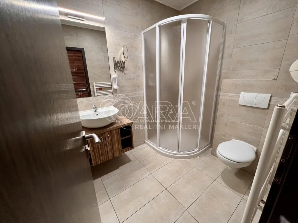 Jedná se o kompletně zrekonstruovanou jednotku, která se nachází ve 2. NP cihlového domu s výtahem. Skládá se z předsíně, která je vybavena předsíňovou skříní s botníkem. Také se zde nachází i menší kuchyňská linka, vybavená lednicí s mrazákem, pečící mikrovlnnou troubou s grilem a přenosným jednoplotýnkovým vařičem. Z předsíně se dostaneme do obytné části, která je zařízena jídelním stolem s židlemi, komodami, rozkládací postelí s matracemi a menší televizí. Koupelna je přístupná z předsíně a je vybavena sprchovým koutem, umyvadlem, skříňkou pod umyvadlem a WC.