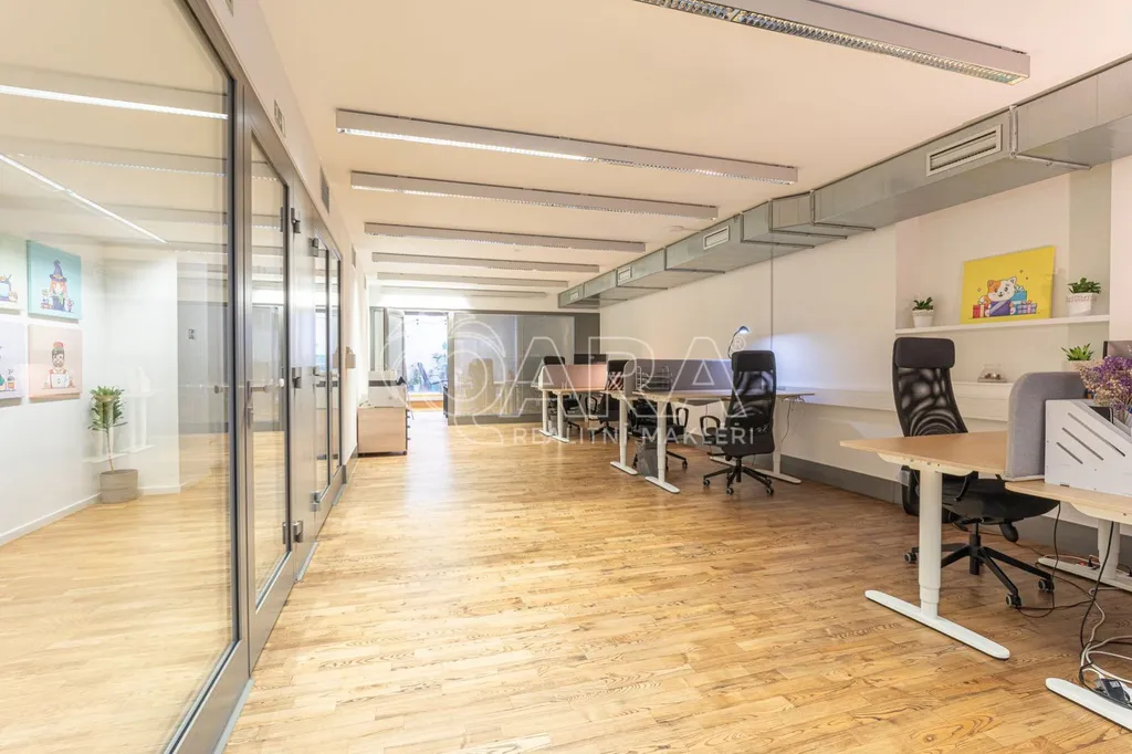 Prostor o celkové rozloze kanceláří 335 m je klimatizovaný. Dispozice nabízí dvě větší otevřené místnosti, dvě místnosti oddělené skleněnou stěnou, přičemž jedna z nich má vstup na terasu o velikosti 17 m, samostatnou uzavřenou místnost, zasedací místnost a prostor pro recepci či posezení návštěv. Zázemí zahrnuje kuchyňku, jídelní kout, 2x moderní sociální zařízení se sprchou, serverovnu a úklidovou místnost.