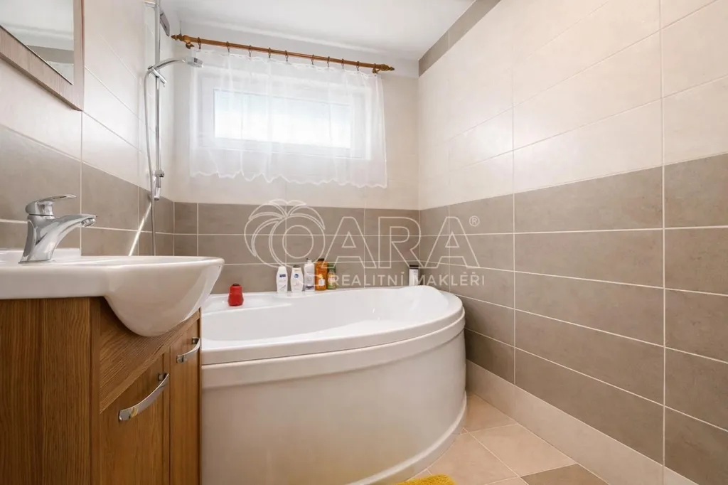 Dispozice domu je velmi praktická. V přízemí se nachází vstupní část s předsíní a halou, koupelna se sprchovým koutem, WC a tři samostatné místnosti. Jedna z nich vznikla úpravou původní garáže a dnes slouží jako plnohodnotný obytný prostor. Přízemí tak nabízí variabilní využití, například jako pracovna, pokoj pro hosty, zázemí pro podnikání nebo oddělená část pro vícegenerační bydlení.