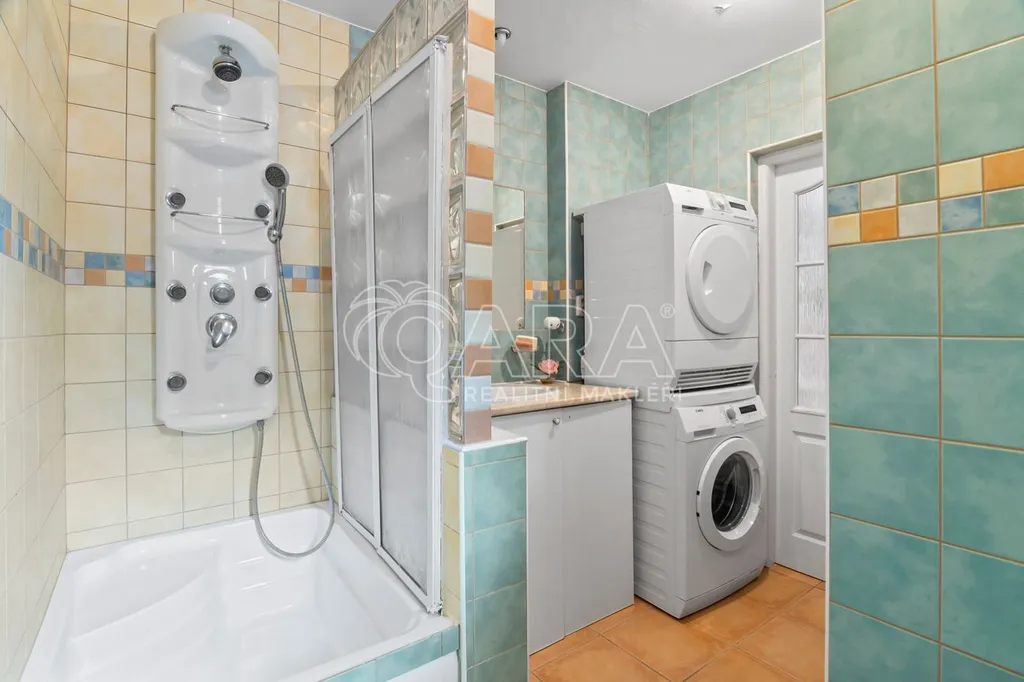 V přízemí domu najdete velký obývací pokoj s kuchyňským koutem, který je kompletně vybavený spotřebiči (horkovzdušná i mikrovlnná trouba, lednice, myčka, varná deska i odsavač par). Dále v přízemí domu najdete velkou obytnou halu, toaletu, koupelnu se sprchovým koutem a dalším toaletou a bidetem, a zimní zahradu. Je zde také velká ložnice vybavená klimatizací, elektricky ovládanými střešními okny a přístupem do domácího wellness centra.