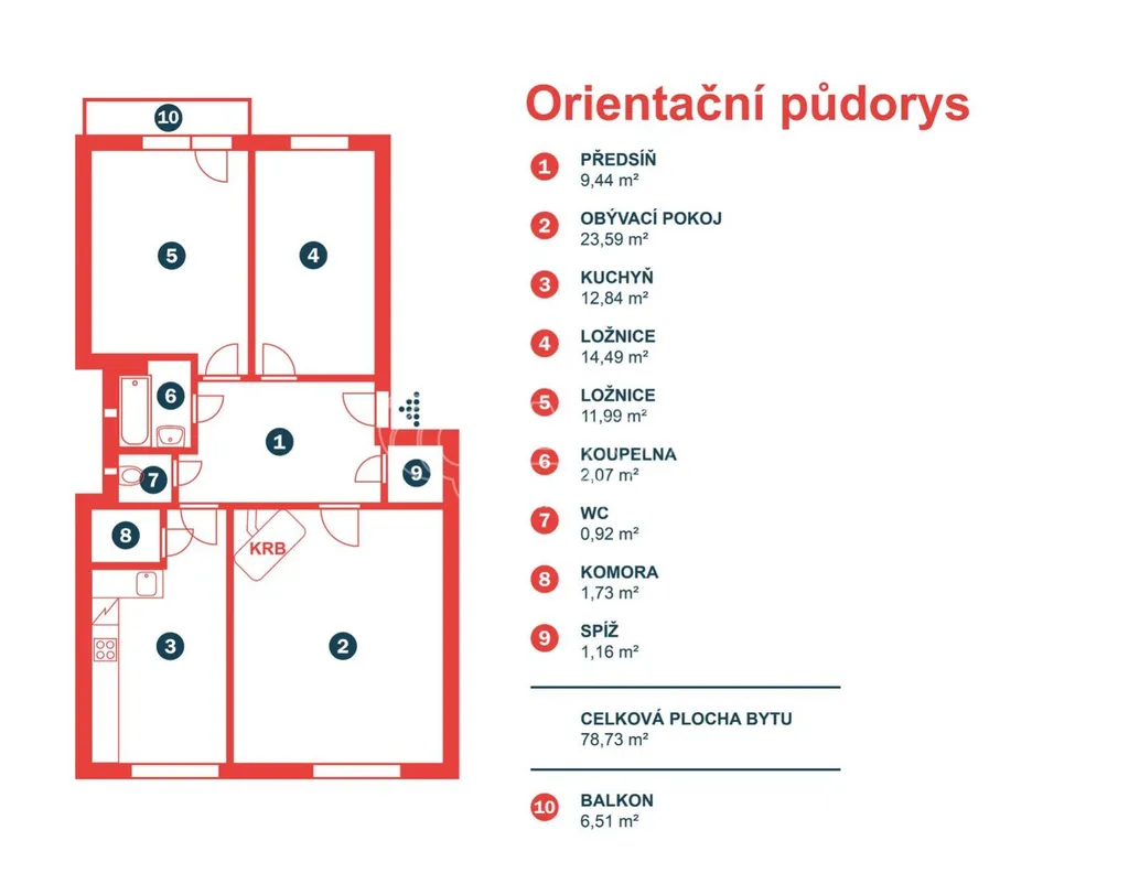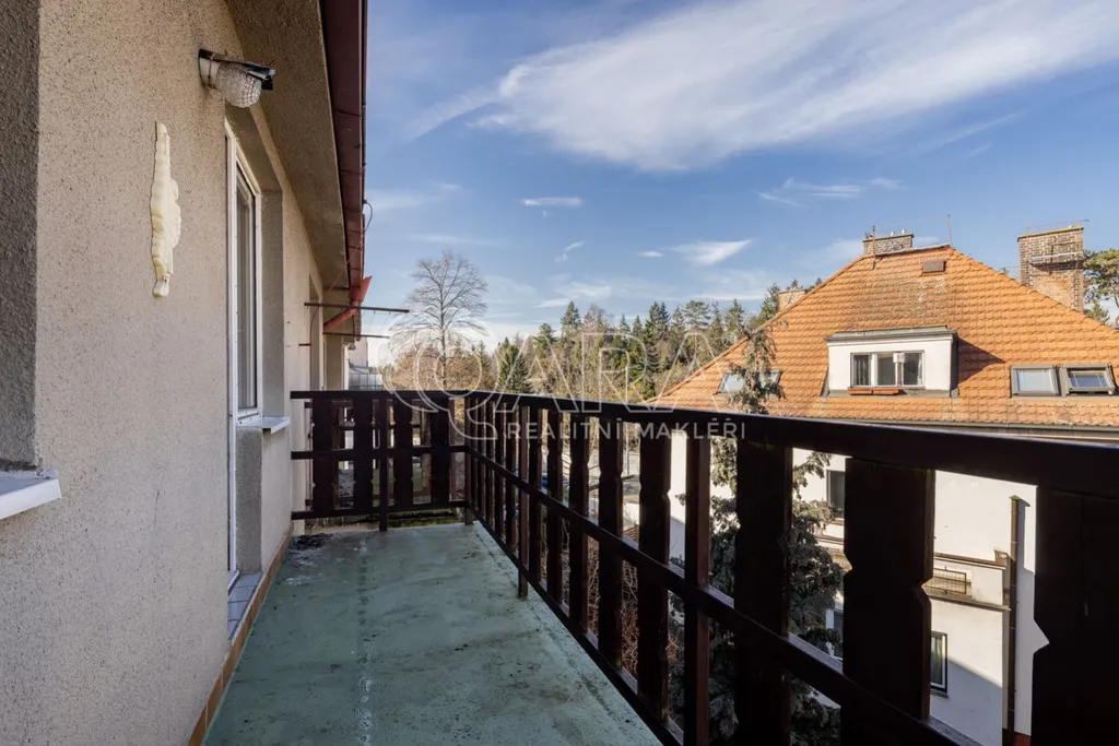 Byt o celkové výměře 85,24 m (vnitřní výměra 78,73 m, balkon 6,51 m) je vyřešen velmi prakticky a tvoří jej: hala, 2x pokoj, kuchyň se spíží, obývací pokoj, koupelna s vanou, samostatné WC a komora. Orientace obývacího pokoje a kuchyně je na jih s výhledem do parku Fr. Suchého, ostatní dva pokoje jsou orientovány na sever. Z většího z pokojů je přístup na balkon. Měsíční poplatky za byt jsou 993,- Kč + elektřina a plyn. Vytápění a ohřev vody zajišťuje vlastní plynový kotel, v obývacím pokoji je funkční krb. K bytu náleží malý půdní prostor přístupný z haly.