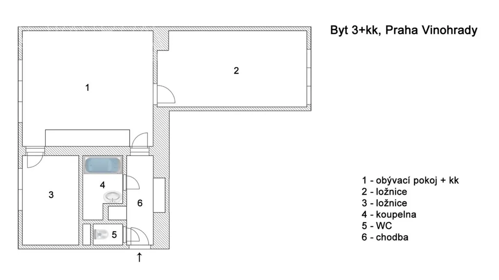 Byt 3+kk o podlahové ploše 56 m2 se nachází ve 5. nadzemním podlaží cihlového domu ze 70. let. Náleží k němu zděný sklep, který má další 2 m2. Obývací pokoj s kuchyní a menší pokoj jsou orientovány na sever do vnitrobloku a na jižní straně do ulice se nachází větší z ložnic.