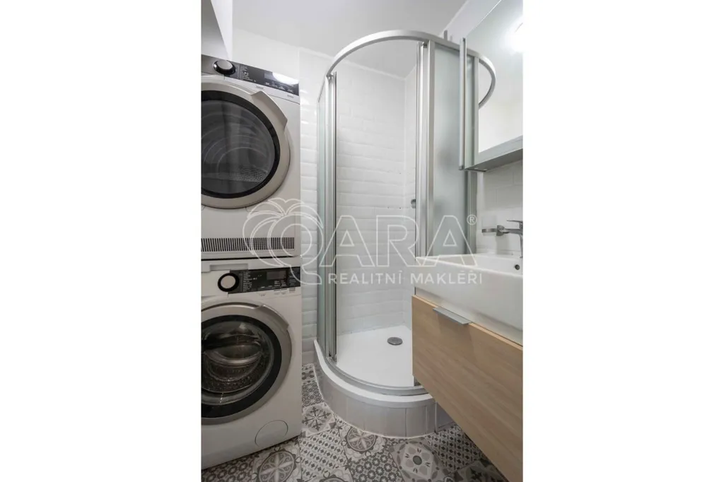 V koupelně pračka a sušička, kuchyňská linka včetně spotřebičů: vestavná lednice s mrazákem, mikrovlnná trouba, el. trouba, plynový sporák a digestoř.