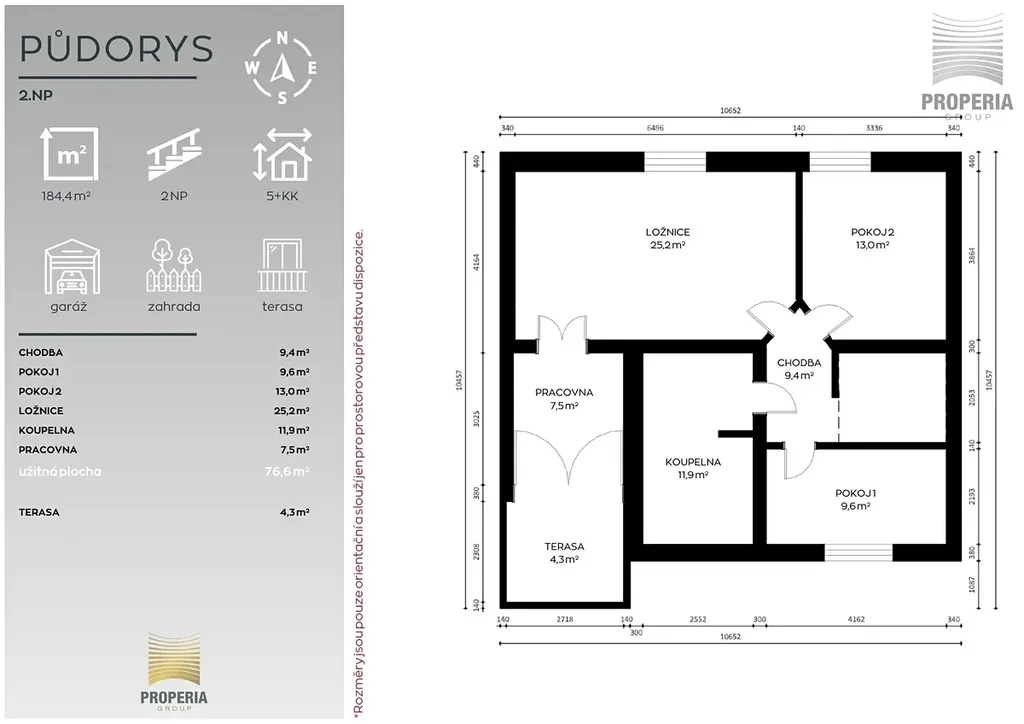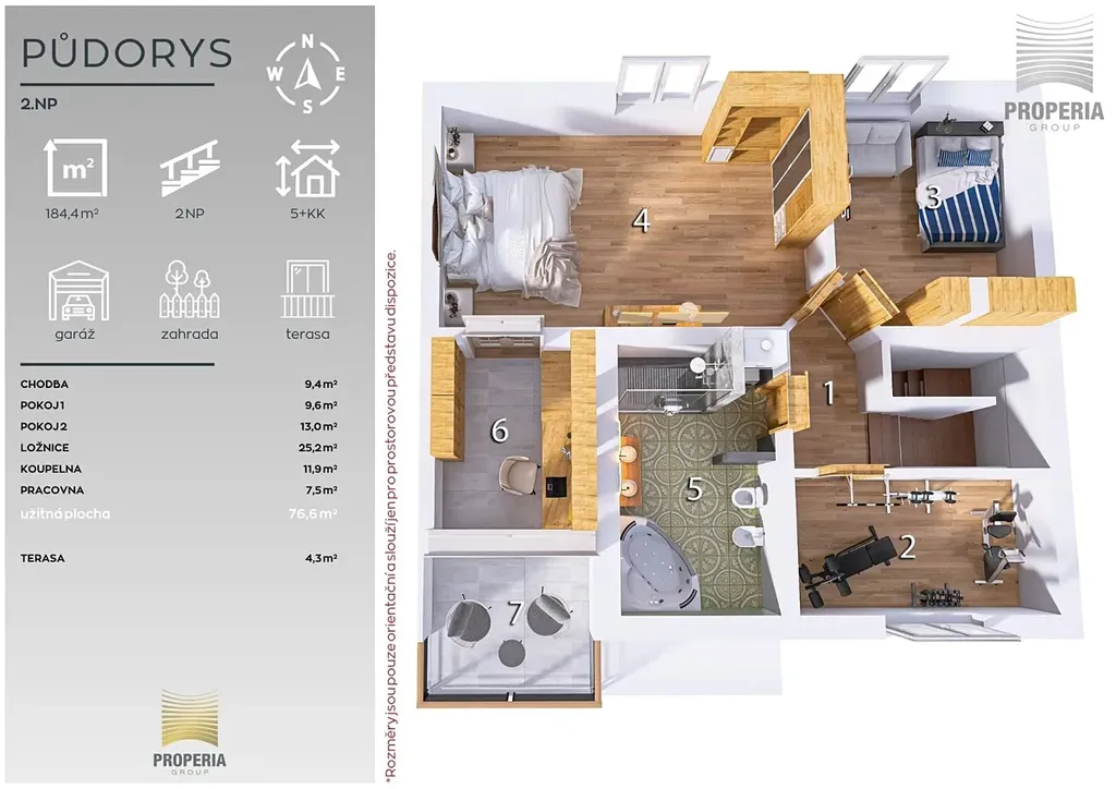 V horním podlaží na vás čeká klidová zóna domu. Hlavní ložnice s pracovnou, která je ideálním místem pro tiché ráno nebo chvíli s knihou, má vlastní vstup na terasu o velikosti 4,3 m². Dva další pokoje nabídnou dostatek prostoru pro děti, hosty či studovnu. Komfort doplňuje koupelna se sprchovým koutem i vanou, která splní požadavky celé rodiny.