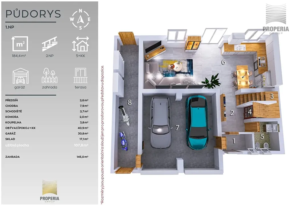Zahrada o ploše 145 m² je místem, kde vznikají vzpomínky. Nabízí dostatek prostoru pro dětské hry, rodinné oslavy i klidné večery u venkovního krbu. Lze uvažovat i o vybudování bazénu a vytvořit tak vlastní letní oázu.