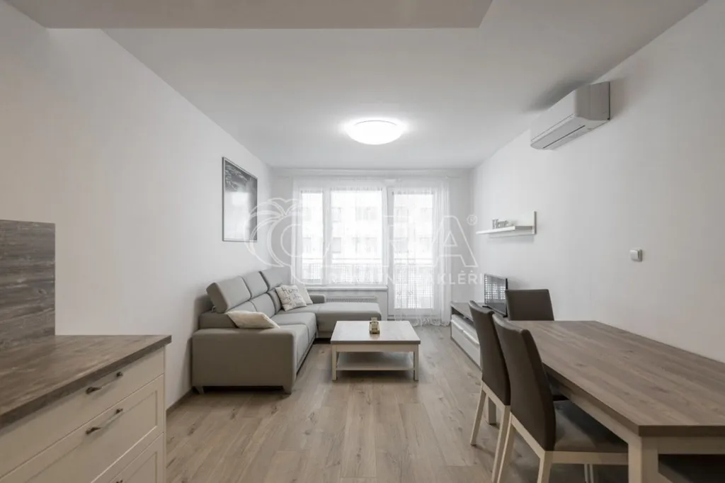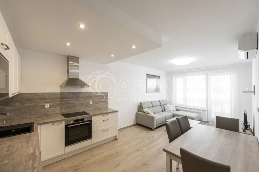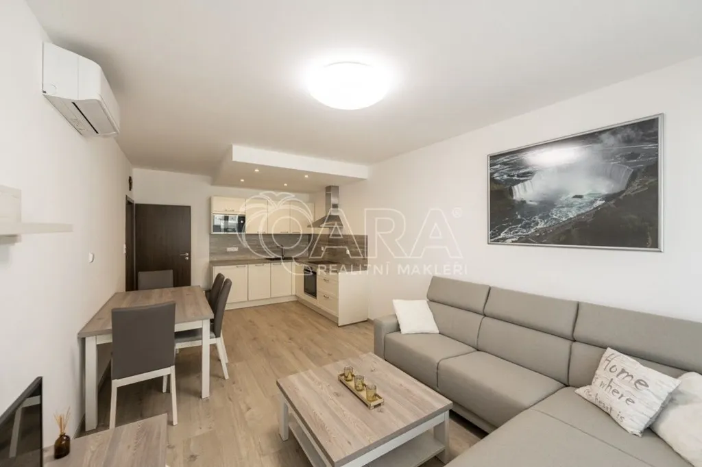 Byt je vybavený klimatizací a nábytkem, který vidíte na fotografiích. Nabízí velký obývací pokoj s balkonem 5,8m2 a s kuchyňským koutem s kvalitními spotřebiči. V samostatné ložnici je vestavěná skříň a manželská postel, částečně oddělená policovou zástěnou od jednolůžkové postele, takže se v pokoji kvalitně vyspí tři lidé. V koupelně je pračka, vana a toaleta. Z předsíně je vstup do všech místností a do komory s regálem. Vstupní dveře jsou bezpečností, podlahy jsou plovoucí. V domě je kamerový systém a k dispozici kolárna a kočárkárna. Energetická náročnost je třídy B velmi úsporná.