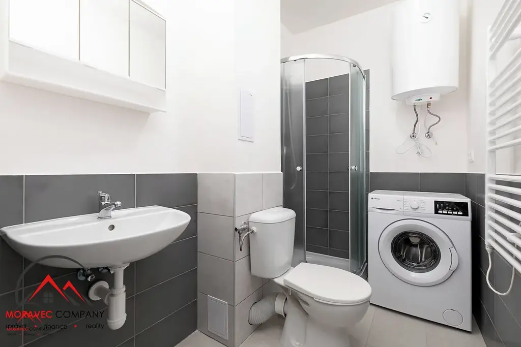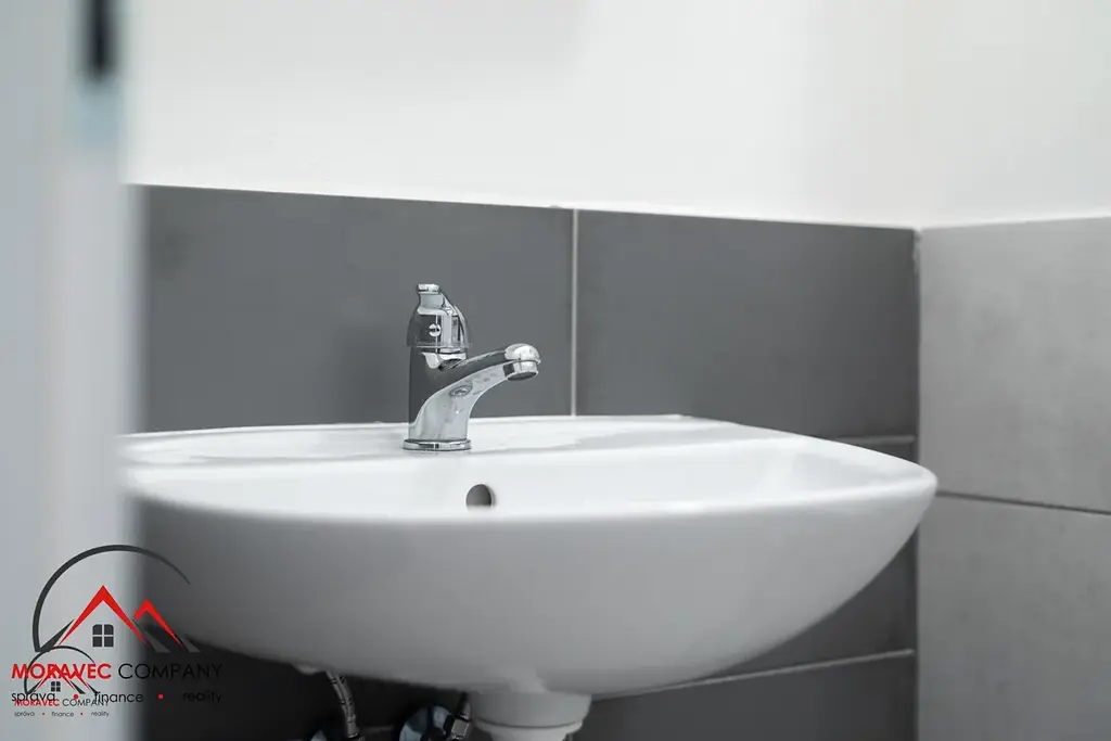 Vybavení bytu zahrnuje kuchyň s elektrickou troubou, indukční varnou deskou, digestoří, mikrovlnkou a zabudovanou lednicí. Koupelna je vybavena sprchovým koutem, pračkou a WC. Ohřev vody zajišťuje elektrický bojler.