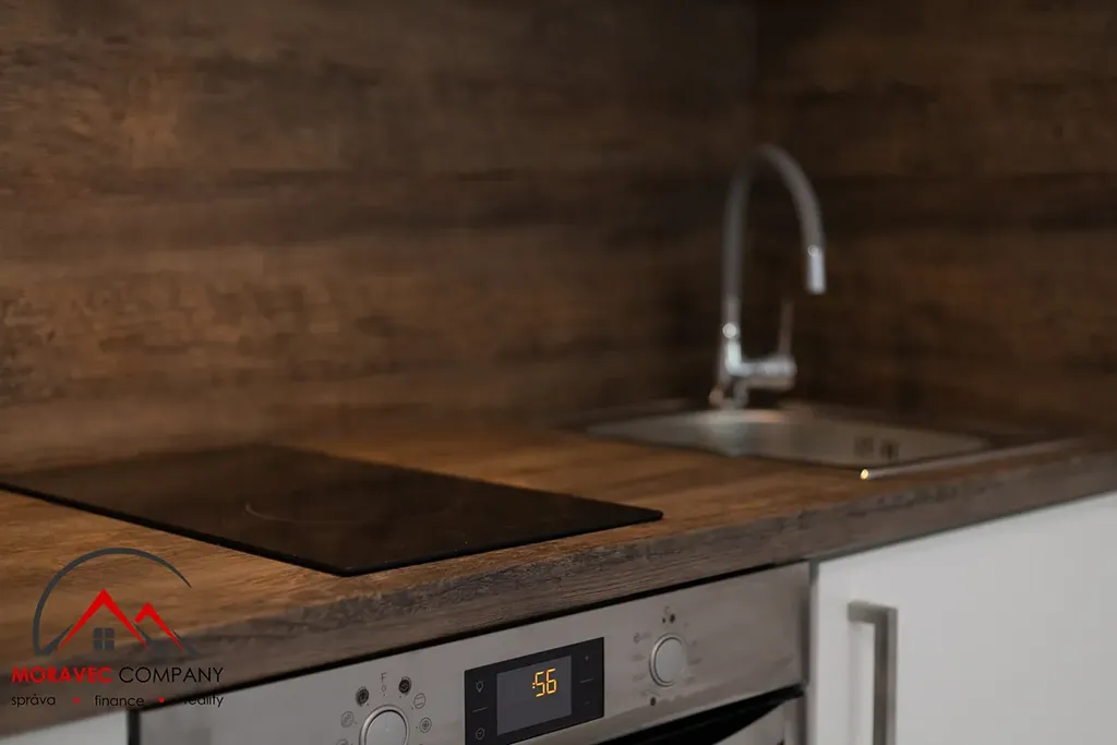 Vybavení bytu zahrnuje kuchyň s elektrickou troubou, indukční varnou deskou a digestoří, koupelna je vybavena sprchovým koutem, zrcadlovou skříňkou na hygienické potřeby a WC. Ohřev vody zajišťuje elektrický bojler.