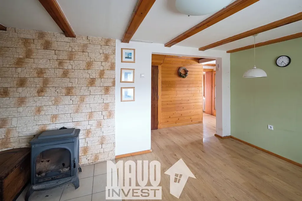 Obývací prostor s kamny nabízí příjemnou atmosféru. Kuchyň má praktické uspořádání a dostatek úložného prostoru. V podkroví se nachází ložnice. K dispozici jsou dvě koupelny, jedna se sprchovým koutem, druhá s vanou. Nechybí ani technické zázemí a dílna pro kutily.
