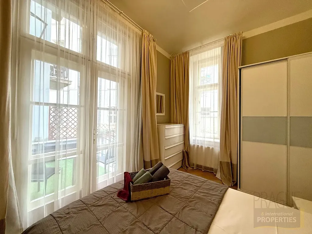 Exkluzivní secesní apartmán 2+1 o rozloze 54 m² v srdci Starého Města — Maiselova, Praha 1. Velmi vkusně zařízený byt ve zvýšeném přízemí reprezentativní budovy s recepcí je orientován do zeleného vnitrobloku. Nabízí vstupní halu, samostatnou plně vybavenou kuchyni, útulnou ložnici a koupelnu s vanou. Světlý obývací pokoj s pohodlnou rozkládací sedací soupravou, křeslem, TV stěnou a elegantní jídelní zónou plynule navazuje na soukromou terasu s posezením a zeleným dvorkem — část dvora o výměře 45,82 m² je výlučně užívána vlastníkem jednotky. Byt se pyšní francouzskými okny jak v ložnici, tak v obývacím pokoji, která vnášejí do interiéru světlo a přímé propojení s terasou. Komfortní kombinace městského života a klidného zeleného zázemí uprostřed historického centra. Všechny služby, exkluzivní butiky, kavárny a restaurace v dosahu, OC Palladium i Kotva cca 10 min pěšky, metro Staroměstská pouhé 3 minuty. Ideální jako prestižní bydlení i výnosná investice pro krátkodobé pronájmy. Luxusní adresa, která okouzlí.