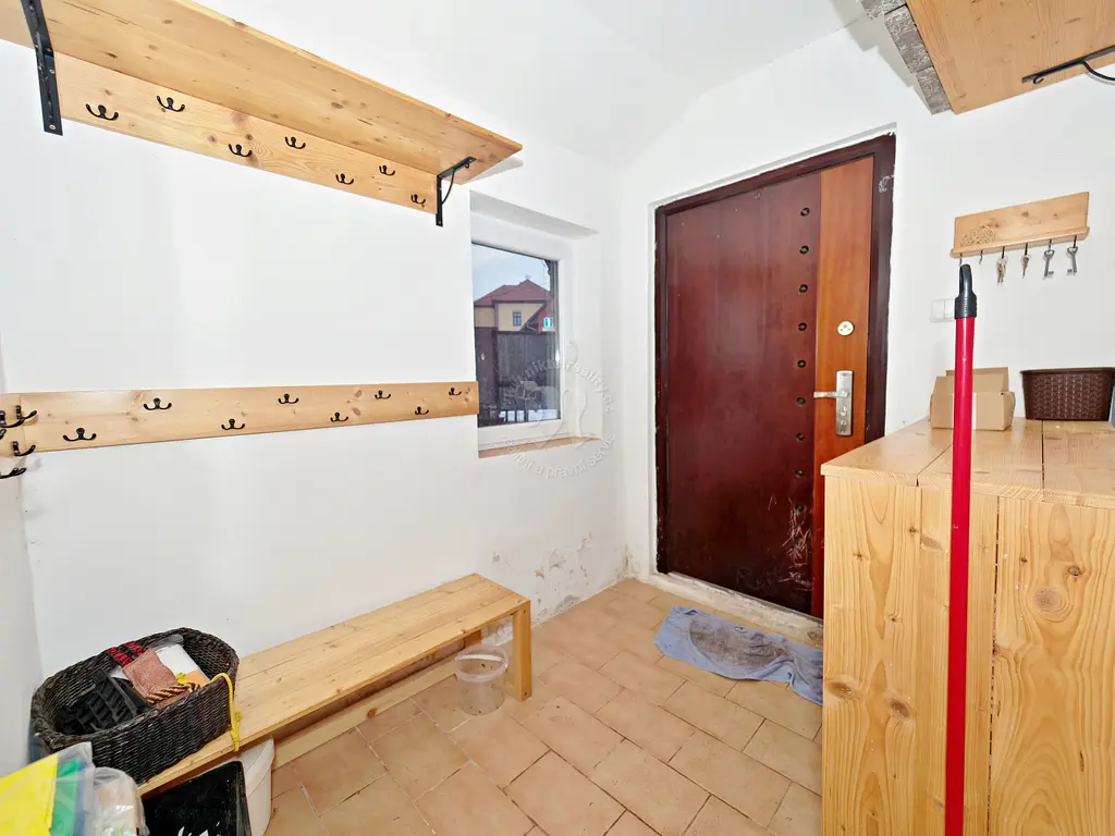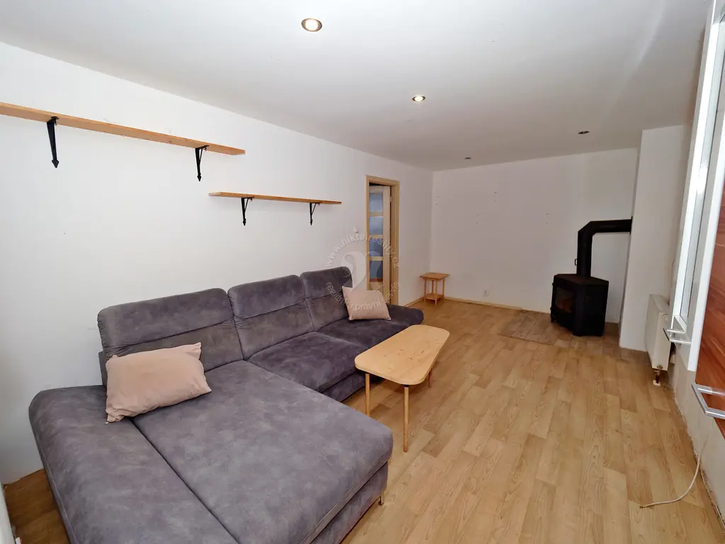 Dominantou interiéru je prostorná kuchyně (18 m²) s novější kuchyňskou linkou a s výhledem do vlastního uzavřeného dvorku, který poskytuje naprosté soukromí. Na kuchyň navazuje obytná část domu se světlým obývacím pokojem (17,5 m²) s instalovanými krbovými kamny, ložnicí (20 m²) a dětským pokojem (13 m²).