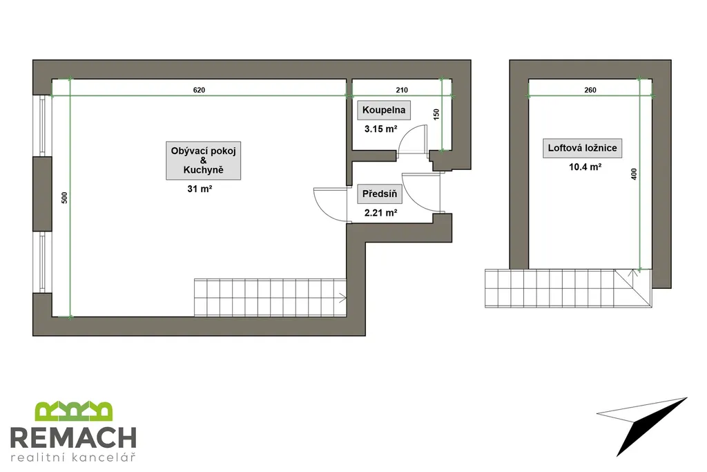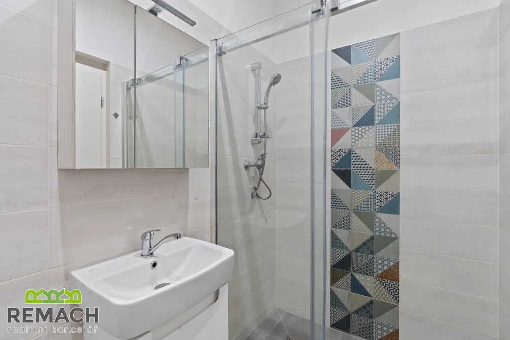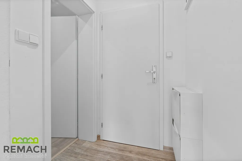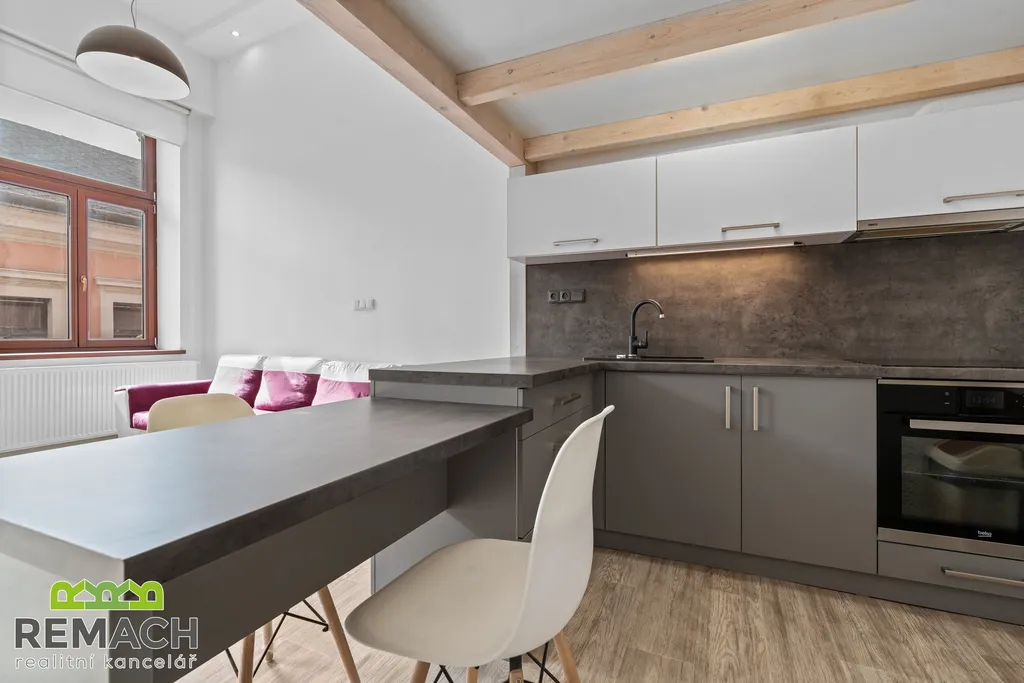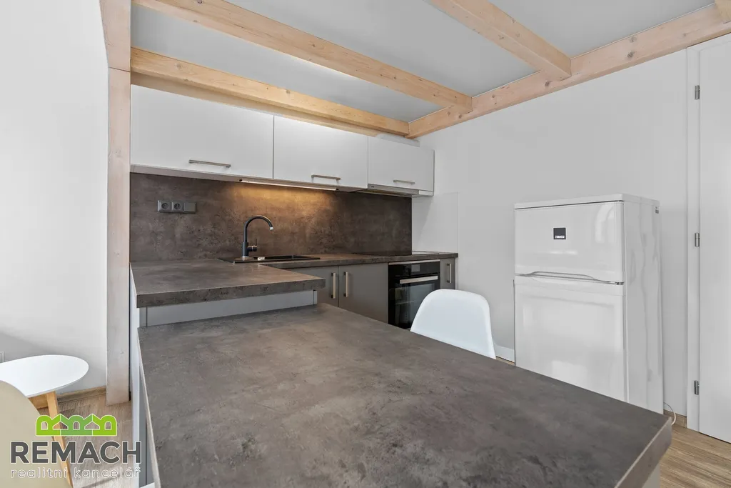 Ve spodní části bytu máte vstupní chodbu s botníkem, koupelnu se sprchovým koutem a poté vstup do obývacího pokoje s kuchyňskou linkou. Důmyslně je řešen úložný prostor pod schody, které vás dovedou do horní spací části, "ložnice", vybavena dále dvěma komodami. Díky loftovému řešení dostáváte vlastně dispozici 2+kk. Byt je částečně vybaven spotřebiči a nábytkem.