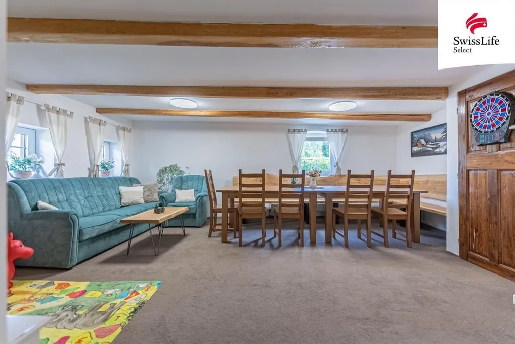 Přízemí: 2 pokoje, herna, prostorná společenská místnost, kuchyň, koupelna se sprchovým koutem
