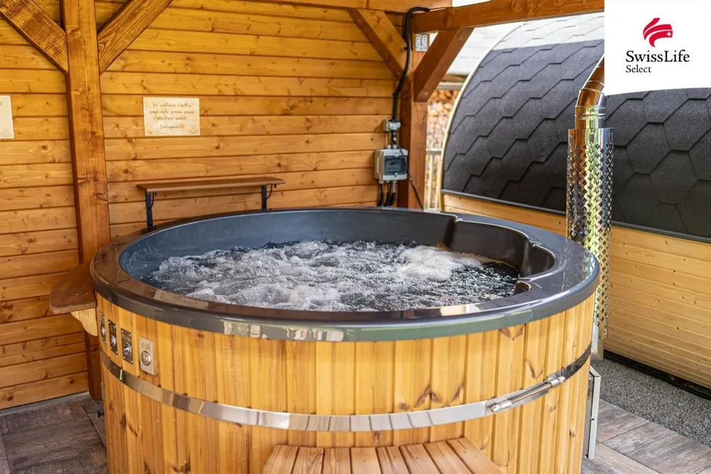 finská sauna s krbovými kamny, vířivka, ochlazovací sud