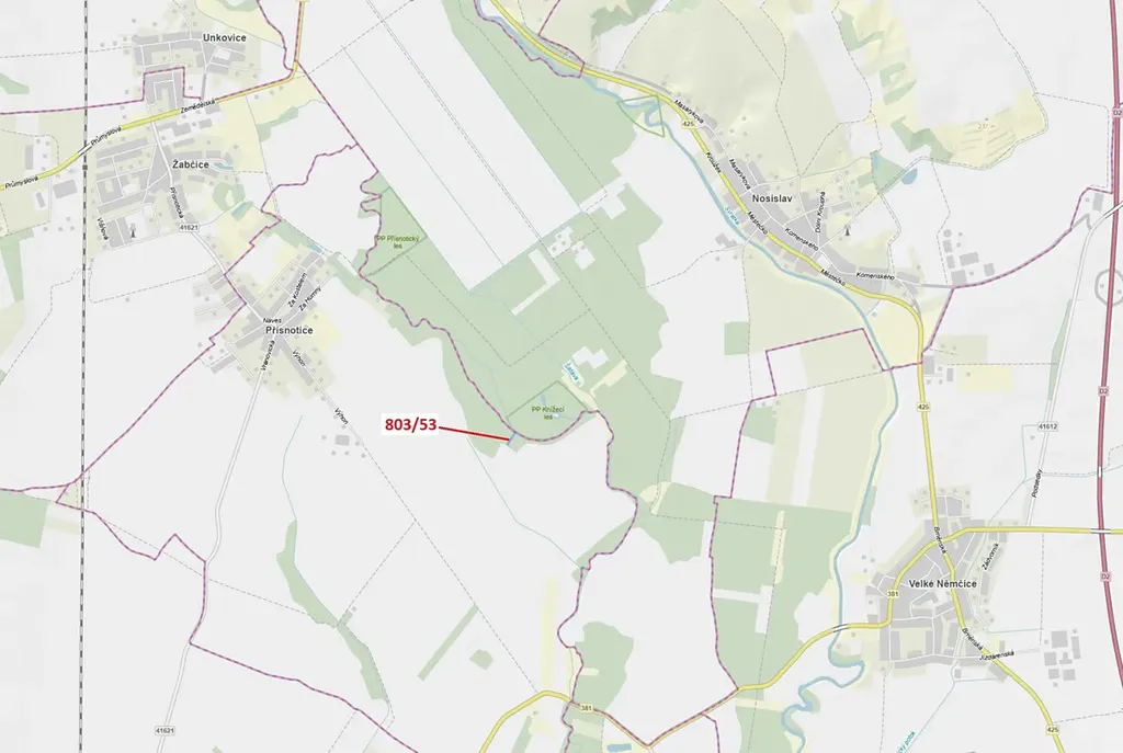 Lesní pozemky o výměře 1135 m2, parcelní číslo 803/53, podíl 1/1, katastrální území Přísnotice, obec Přísnotice, obec s rozšířenou působností Židlochovice, okres Brno-venkov, Jihomoravský kraj.