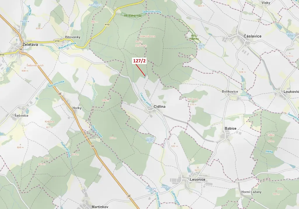 Lesní pozemek o výměře 1615 m2, parcelní číslo 127/2, podíl 1/1, katastrální území Cidlina na Moravě, obec Cidlina, obec s rozšířenou působností Moravské Budějovice, okres Třebíč, Kraj Vysočina.