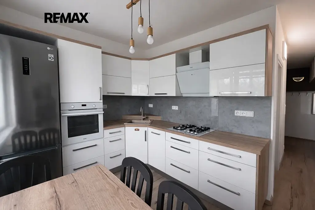 Dispozice bytu je prakticky řešena – z centrální chodby s úložnými prostory se vstupuje do jednotlivých částí bytu. K dispozici je samostatné WC, koupelna, spíž a kuchyň s jídelním koutem. Na kuchyň navazuje jeden velký průchozí pokoj, dále pak samostatný pokoj s přístupem na balkon.