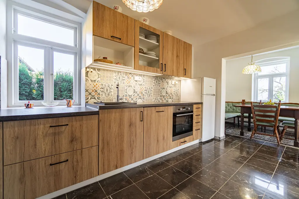Kuchyňská linka je vybavena sklokeramickou varnou deskou, elektrickou troubou, digestoří, myčkou, lednicí a mikrovlnnou troubou.