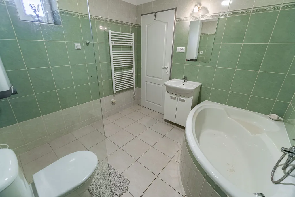 V koupelně je rohová vana, sprchový kout, umyvadlo a toaleta. Je zde také umístěný elektrický bojler o objemu 120l, který zásobuje dům teplou vodou.