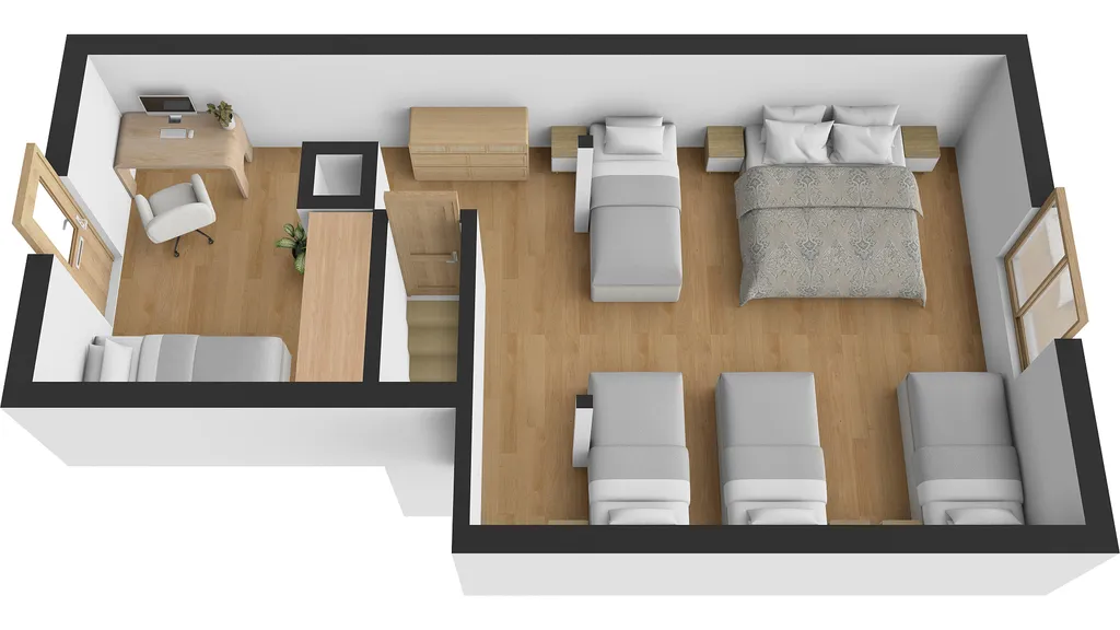 V přízemí domu se nachází kuchyň s jídelním prostorem, prostorný obývací pokoj, ložnice a velká koupelna s toaletou. V patře je poté velká ložnice pro 7 osob, která se po úpravách dá použít jako další 2 pokoje se samostatným vchodem.