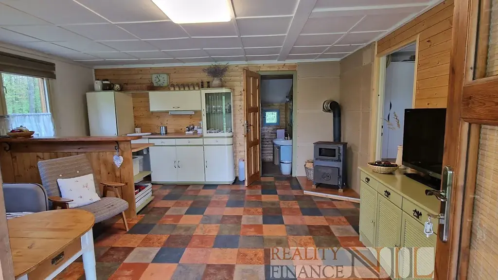 Chata má dispozici 3kk - dva pokoje - jeden se využívá jako jídelna, druhý jako ložnice, dále prostorný obývací pokoj s kuchyňským koutem (vč. elektrické varné desky, lednice a mikrovlnné trouby) , koupelna s WC a prostorem na sprchový kout. Z obývacího pokoje je výstup na terasu cca 12 m2, za domem je místnost na nářadí a zde je také bojler.