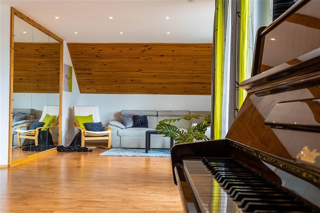 V patře jsou k dispozici dva samostatné pokoje, druhá koupelna, šatna a velkorysý pokoj s balkónem. Praktickým benefitem je také půdní prostor s možností dalšího rozšíření obytné části.