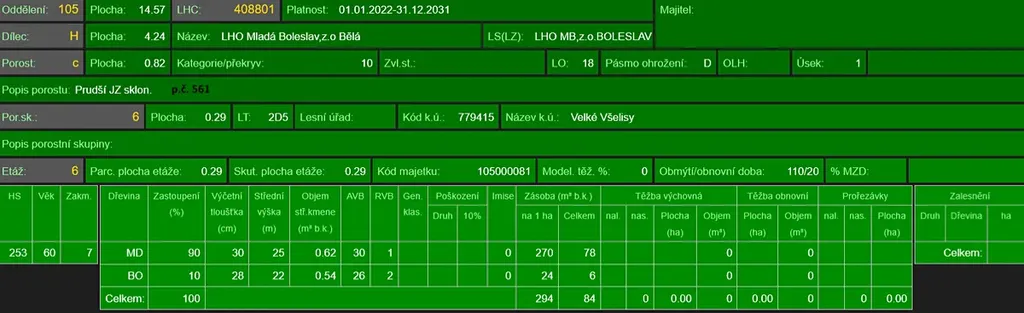- p.č. 561 vedená jako lesní pozemek o celkové výměře 2 910 m2 (stáří lesa 64 let - zastoupení dřevin modřín, borovice).