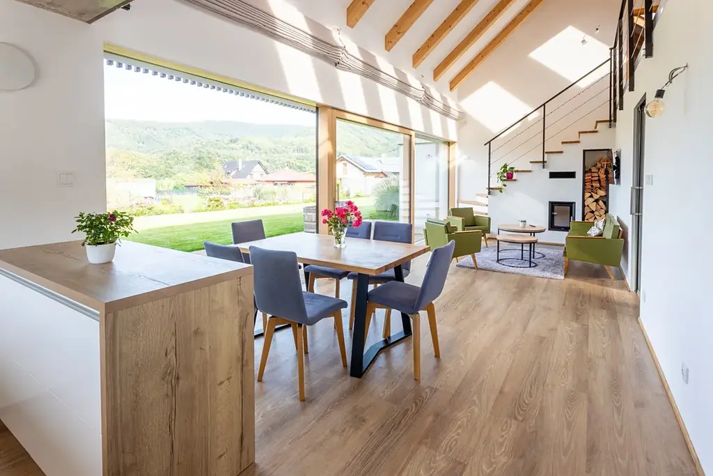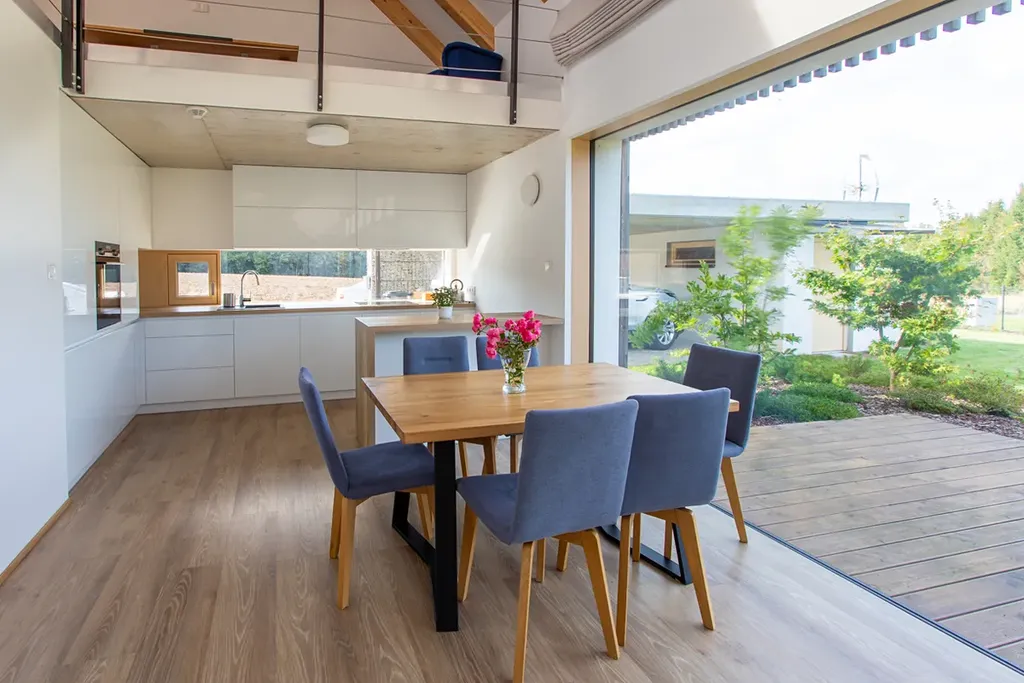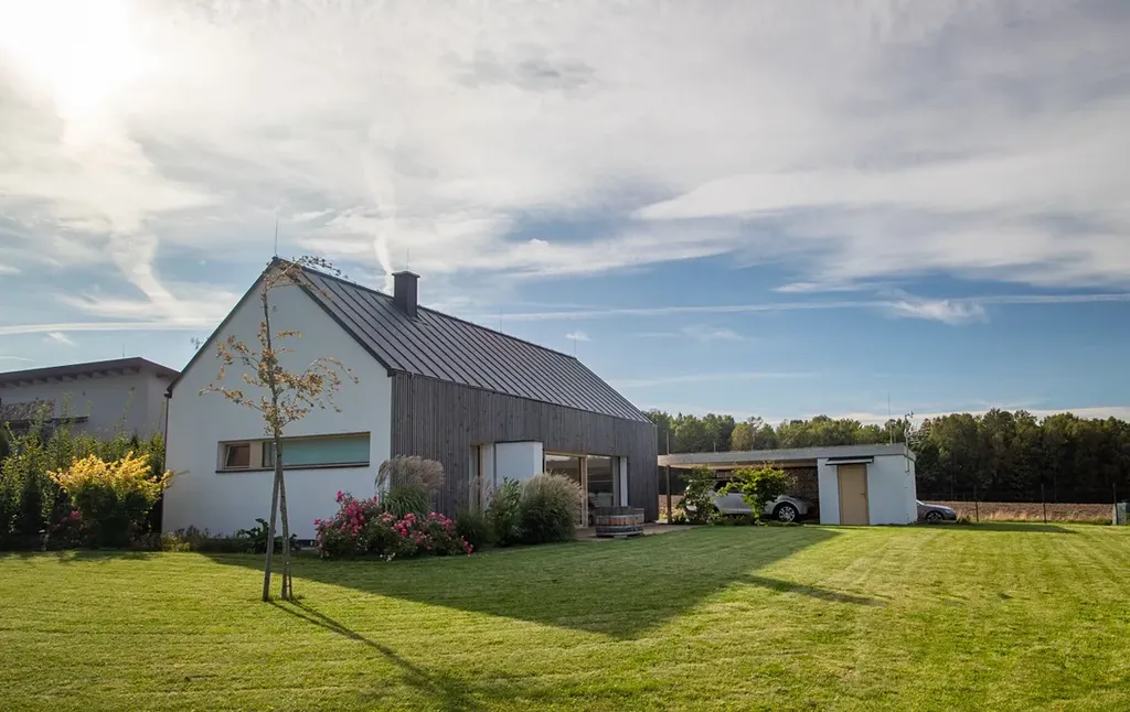 Dům má celkovou plochu 154 m² s dispozicí 3+kk. V přízemí najdete obývací pokoj s propojenou kuchyní a jídelnou, ložnici, koupelnu, 2x WC, technickou místnost a chodbu. První patro nabízí pracovnu a další pokoj. Toto bydlení je vybaveno podlahovým topením s tepelným čerpadlem vzduch-voda a rekuperací, což zaručuje efektivní a ekonomické vytápění. Pro zimní večery si můžete užívat tepla krbu.