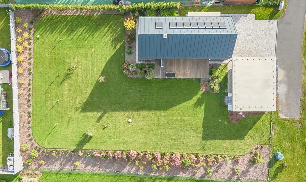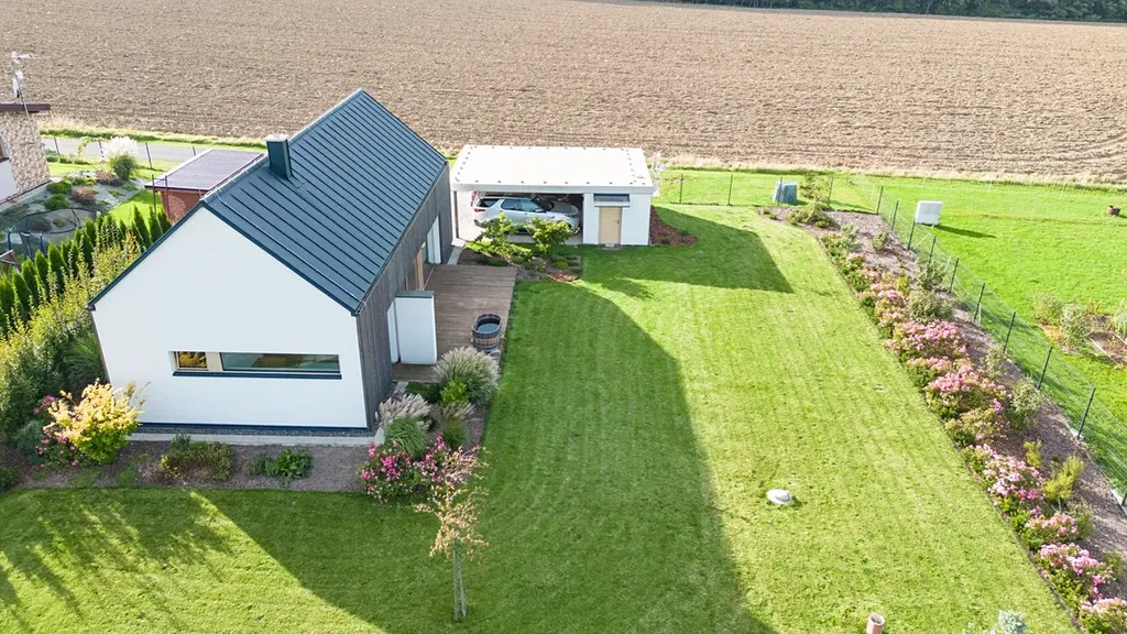 Venkovní prostor tvoří rozlehlá udržovaná zahrada o výměře 1200 m², která nabízí dostatek místa pro rodinné aktivity a relaxaci. K dispozici je také stání pro dvě motorová vozidla s kůlnou.
