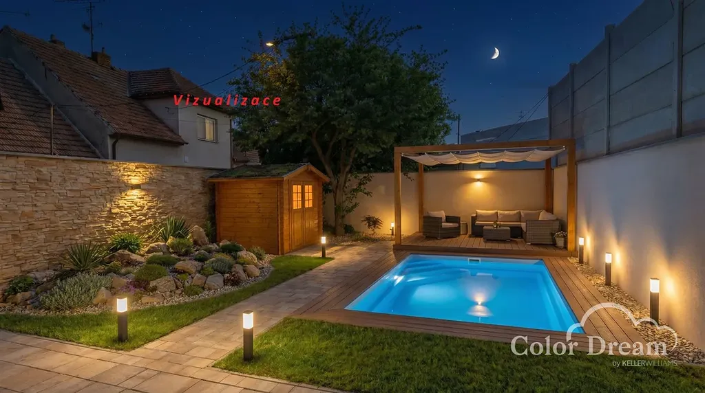 Za domem se nachází příjemná zahrádka/dvůr o výměře cca 147 m². Prostor je rozdělen na rovnou plochu a dvě klidná zákoutí, která poskytují dostatek soukromí díky zástavbě a zdem po dvou stranách. Ideální místo pro posezení, pěstování nebo relaxaci.