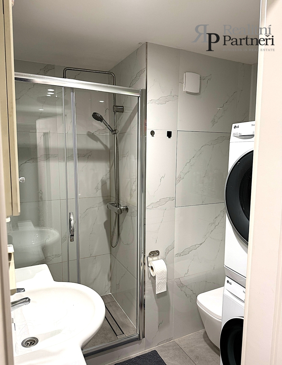 Koupelna se závěsným WC je vybavena keramickými obklady a prostorným sprchovým koutem.
