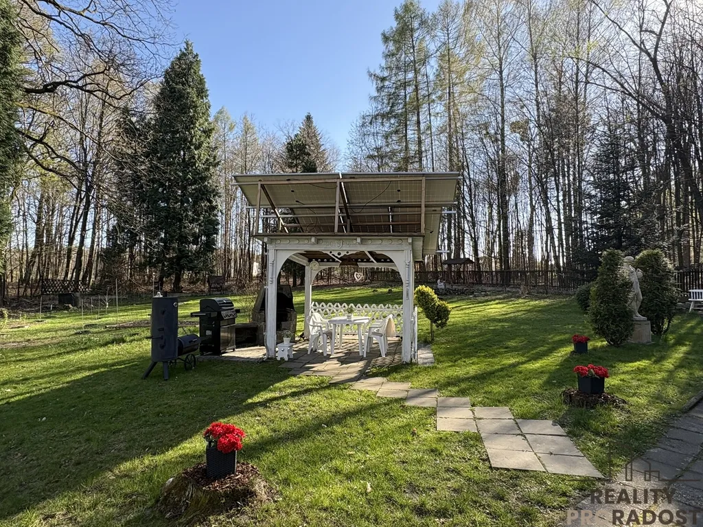Na rovinatém pozemku přímo u lesa se nachází také stylový altán s posezením a grilem